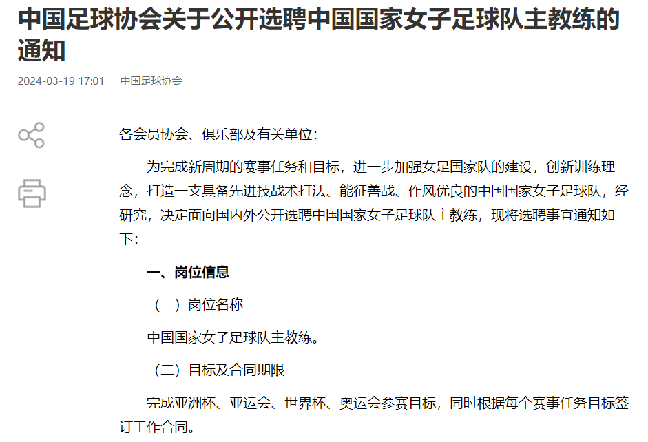 通知介紹,新任主帥需完成亞洲盃、亞運會、世界盃、奧運會參賽目標,同時根據每個賽事任務目標籤訂工作合同。主帥原則上年齡不超過60週歲,國籍不限,需滿足“瞭解國際足球、亞洲足球發展趨勢,瞭解中國國家女子足球隊的基本現狀”在內的多個條件。