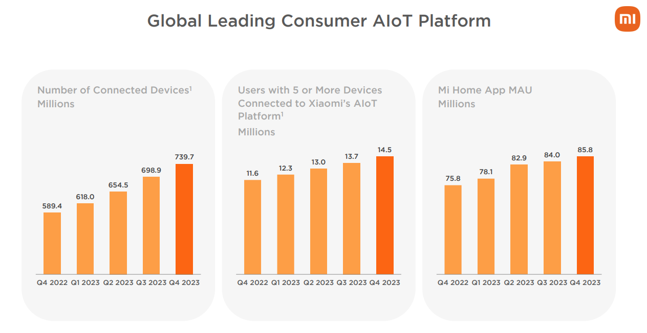 截至2023年底,小米AIoT平台已連接設備(不包括智能手機、平板及筆記本電腦)數達7.40億,同比增長25.5%;擁有五件及以上連接至小米AIoT平台的設備(不包括智能手機、平板及筆記本電腦)用户數同比增長25.3%至1450萬;2023年12月,米家APP月活躍用户數同比增長至8580萬。