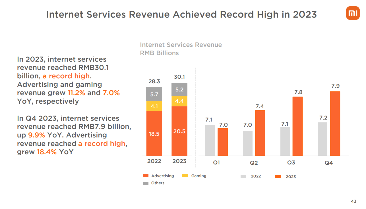 互聯網服務是小米第三大業務,也是毛利率最高的業務,主要包括廣告和遊戲等。2023年,小米互聯網服務收入301億元,同比增長6.3%,毛利率同比提升2.4個百分點至74.2%。