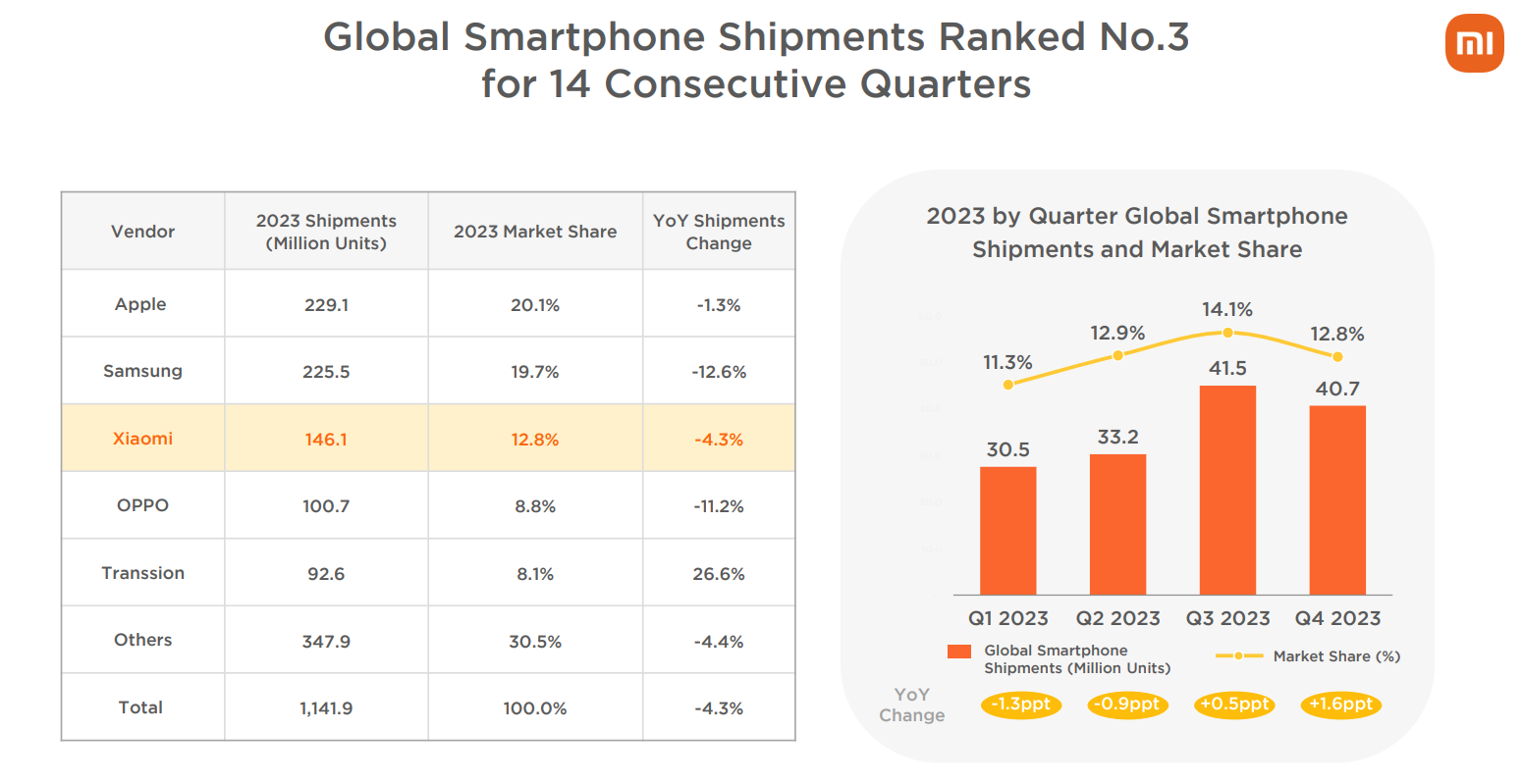 智能手機一直是小米的營收支柱。根據Canalys數據,2023年小米手機出貨量在全球市場仍然位居第三,佔據13%的份額。而在競爭激烈的中國市場,小米去年以13%的份額位居第五,在旺季第四季度,小米出貨逆勢增長12%,但華為以47%的增速反超小米,排名中國第四。