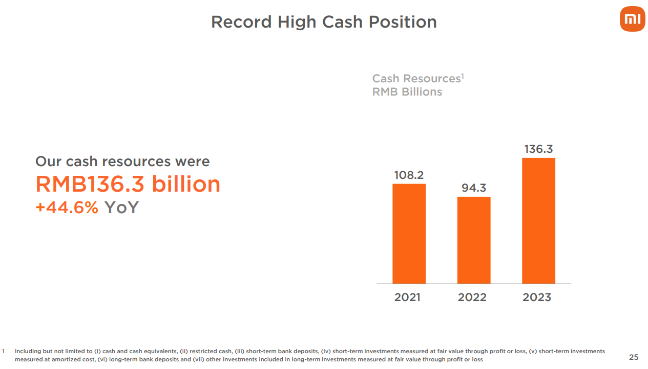 小米汽車上市之後表現如何,仍有待觀察。但從目前來看,在新能源汽車這個激烈競爭的賽道中,小米囤積了充分的“糧草”。截至2023年底,小米現金儲備為人民幣1363億元,創歷史新高。