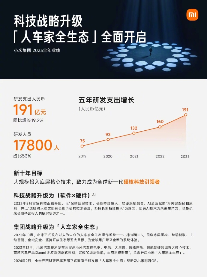 研發方面,去年小米研發支出人民幣191億元,同比增長19.2%,其中,上述提到的汽車相關業務全年投入為67億元。