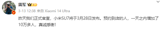 此前官方表示SU7進店相關事宜公佈後,一天之內預約到店試駕人數增加逾10萬人。盧偉冰透露稱,部分單店預約人數超過1萬人,足以見得小米在破圈營銷上的號召力。