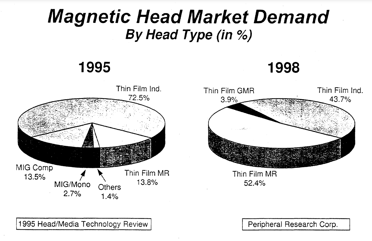 如果説1990年代中期前,新科的硬盤磁頭生意主要依仗的是低成本優勢,在市場上沉浮於一二線廠商之間,那麼隨着磁頭技術路線從薄膜向磁阻的演進,一個“換道超車”的歷史性機會出現了。