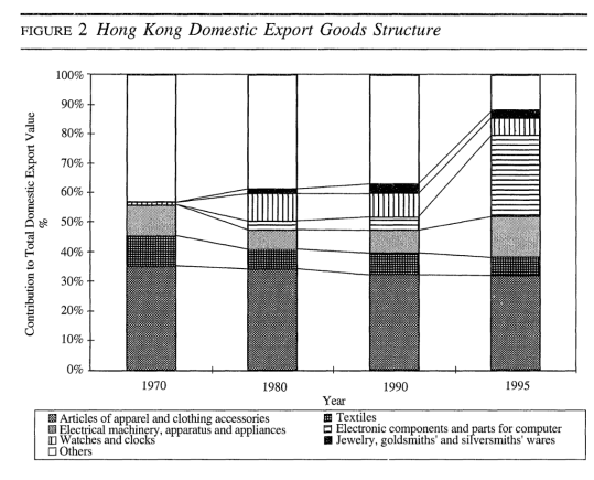 這一“剩者為王”的經典行業案例,植根於當時一派繁榮的香港電子製造業生態,作為出口導向製造業較早起步的地區,香港在1980年已發展成為全球消費電子產品製造中心之一,本地電子製造企業數量達1316家,僱員達到9.3萬人,電子產品出口額佔到香港全部出口總值的12.2%,成為僅次於紡織服裝的第二大創匯產業。