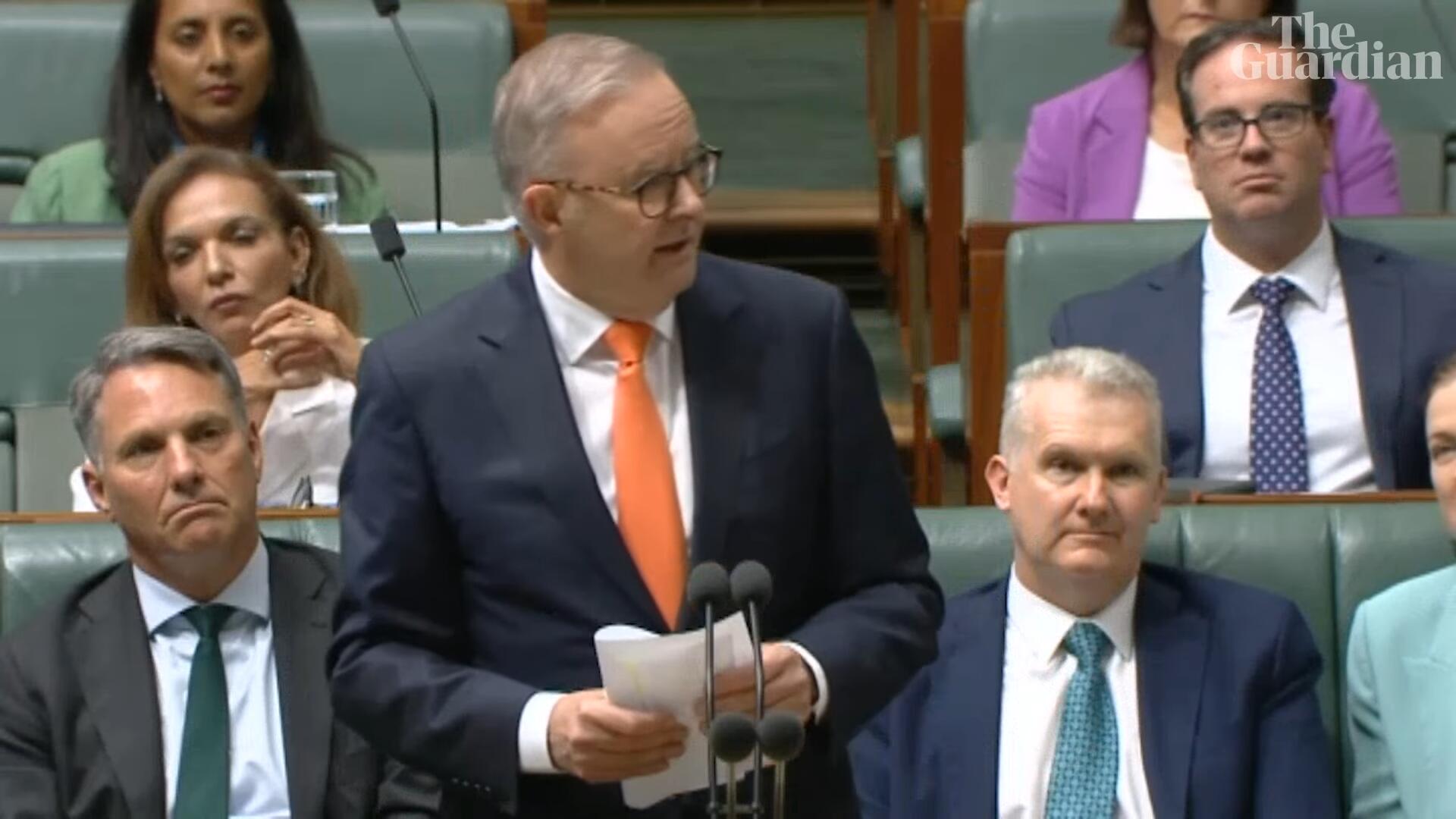 當地時間3月20日,阿爾巴尼斯在議會上為陸克文辯護 衞報視頻截圖