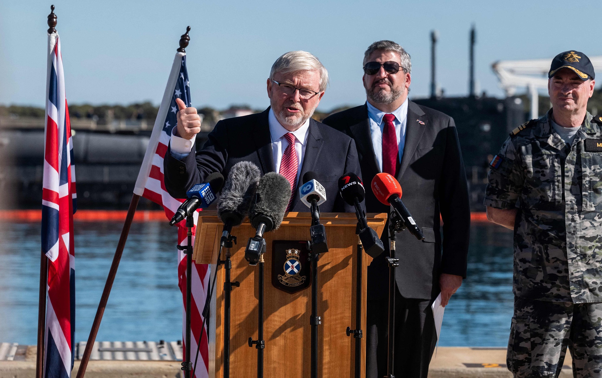 當地時間2023年8月4日,陸克文參觀美國“弗吉尼亞”級北卡羅來納號核潛艇時發表講話 圖自視覺中國