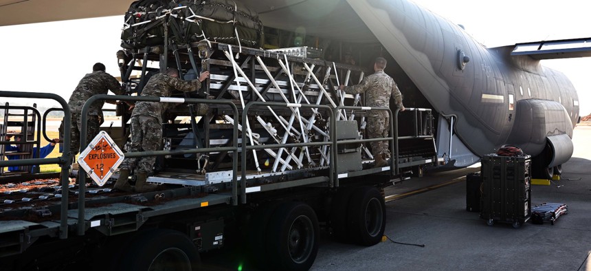 一架向貨艙裏裝載“快速龍”托盤式導彈發射模塊的C-130J 圖片來源:美國空軍