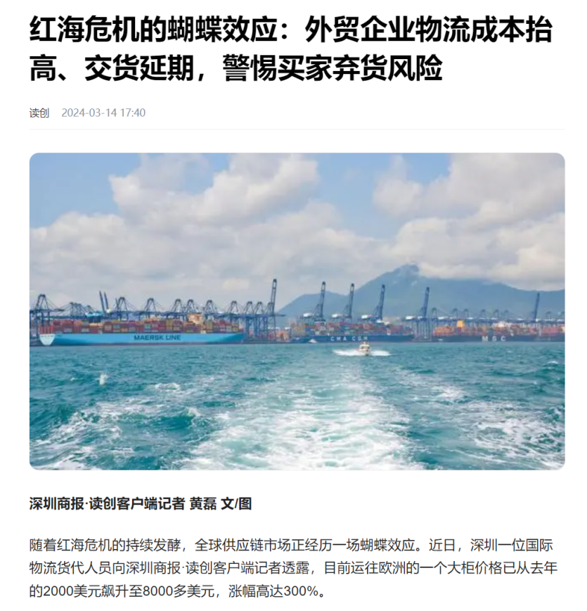 不過隨着地緣政治格局演變以及中歐班列運營日趨成熟,海運固有的規模效應優勢逐漸削弱。具體而言,中歐班列作為一個新興運輸通道,隨着相關貿易量的增長,其運營效率與成熟度不斷提升,運輸成本有望逐步降低。與此同時,紅海及黑海地區局勢動盪,特別是胡塞武裝在紅海上的行動導致海運風險上升、運力受阻,進一步推高了海運成本,打破了原有的一邊倒局面。