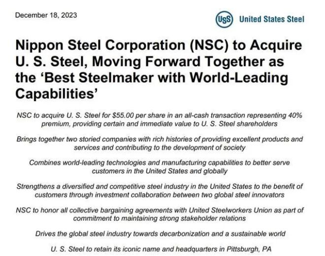在該公司看來,這一收購事項不僅符合美國鋼鐵公司的利益,同樣有益於美國鋼鐵工會和整個美國鋼鐵行業,甚至還對美國的國家安全不無裨益。因為通過該公司所提供的資金和先進技術,將提升美國鋼鐵公司的產品競爭力,改善其相關服務,從而體現出美國的優越性。