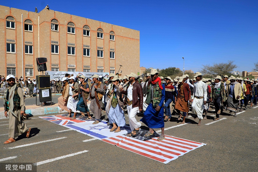 3月7日,也門薩那的武裝人員踩過地上的美國、以色列和英國國旗,以支持巴勒斯坦人。圖片來源:視覺中國