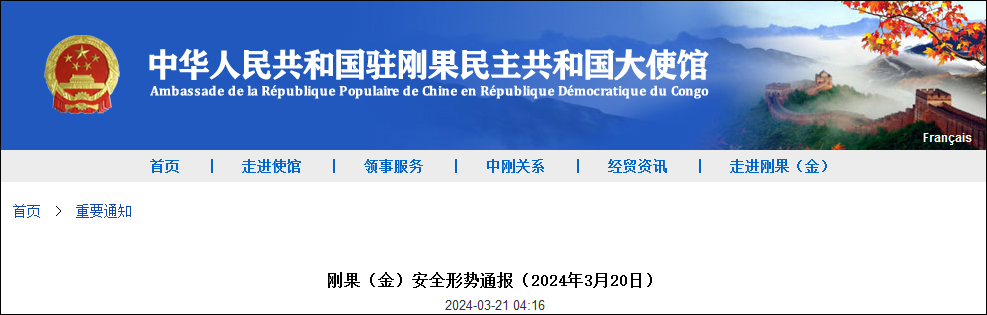 中國駐剛果民主共和國大使館網站3月21日發佈《剛果(金)安全形勢通報》。