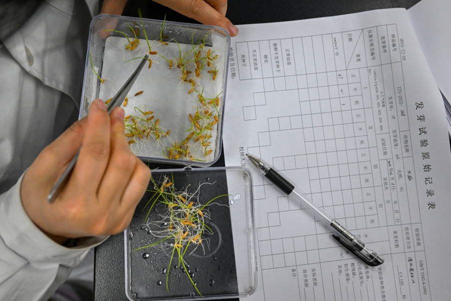 2022年3月23日,在湖南省農作物種質資源庫實驗室,檢測員對保存的水稻種子進行發芽試驗檢測。