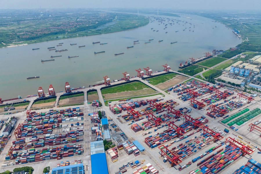 2023年7月5日拍攝的武漢陽邏港一期碼頭(無人機照片)。