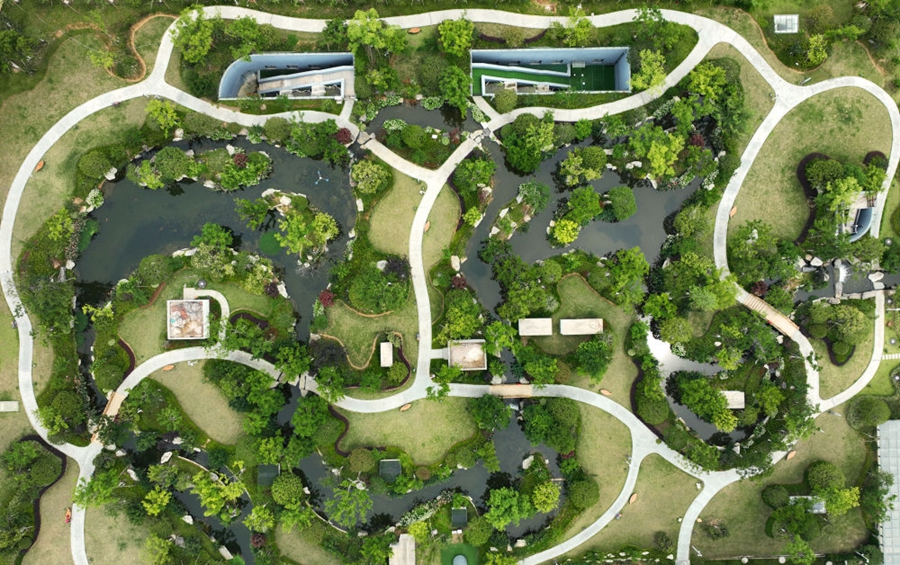 這是2023年6月15日拍攝的以“地上花園+地下治污”設計理念建設的九江市雙溪公園(無人機照片)。近年來,江西省九江市啓動中心城區水環境綜合整治工程,通過地下污水治理、岸線生態修復、興建“公園式”污水處理廠、城市智慧管網管控等措施,改善水環境,城市面貌煥然一新。