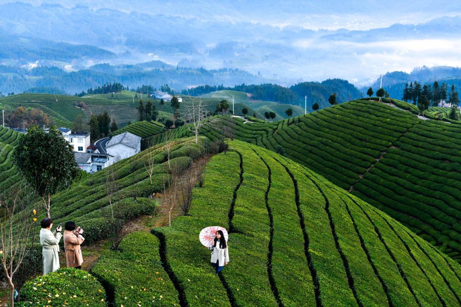 2023年12月6日,遊客在湖北省鶴峯縣走馬鎮木耳山茶園觀光。近年來,鶴峯縣在發展壯大茶產業的同時,積極探索茶旅融合發展之路,打造多片集採摘、觀光於一體的萬畝茶園,讓茶農實現“茶旅雙豐收”,助力鄉村振興。