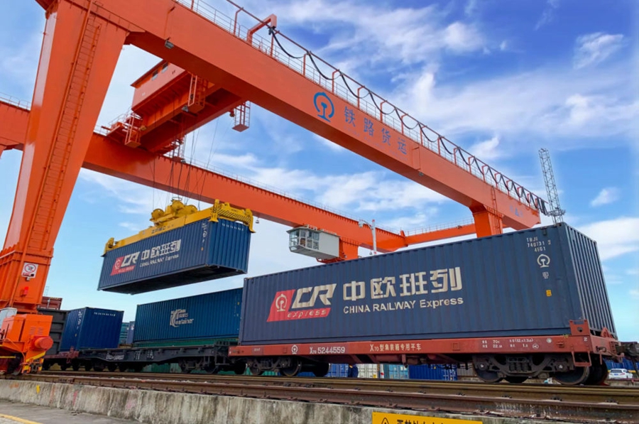 2022年4月29日,在鐵路合肥北站物流基地集裝箱作業區,龍門吊吊裝準備發運的中歐班列集裝箱。