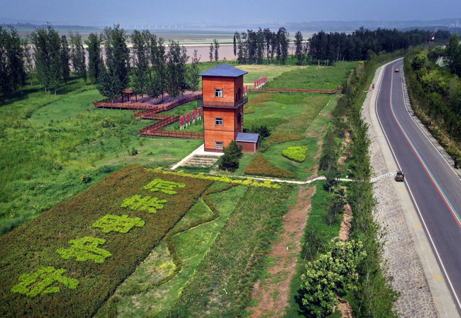 這是2022年8月10日拍攝的位於河南省三門峽市的黃河生態廊道(無人機照片)。