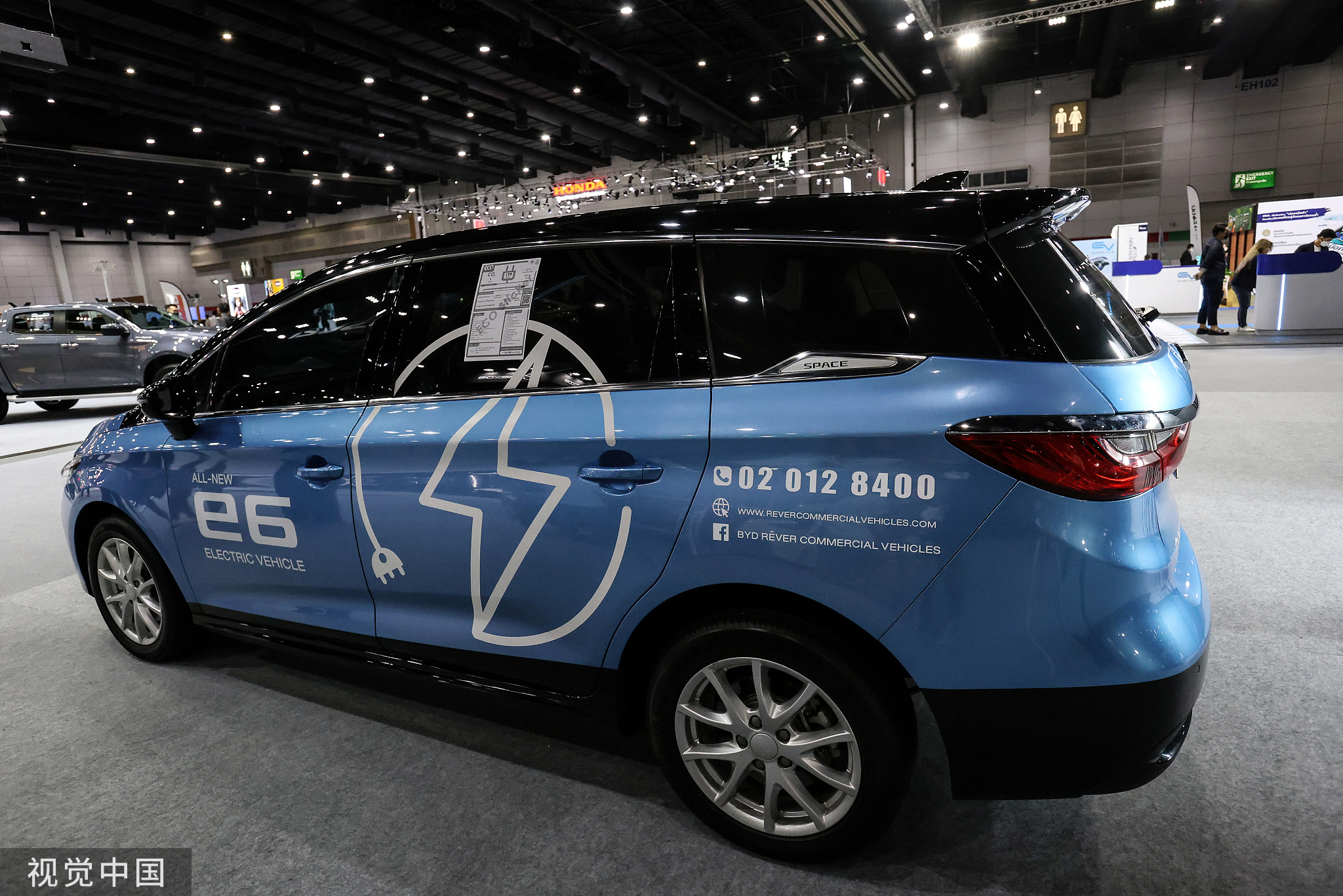 2023年7月5日,在曼谷國際會展中心舉行的泰國電動汽車博覽會上,比亞迪E6車型正在展出 圖自視覺中國