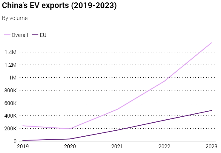 2019年至2023年中國電動汽車出口量 淺紫色代表“整體出口量”、深紫色代表“對歐洲出口量”