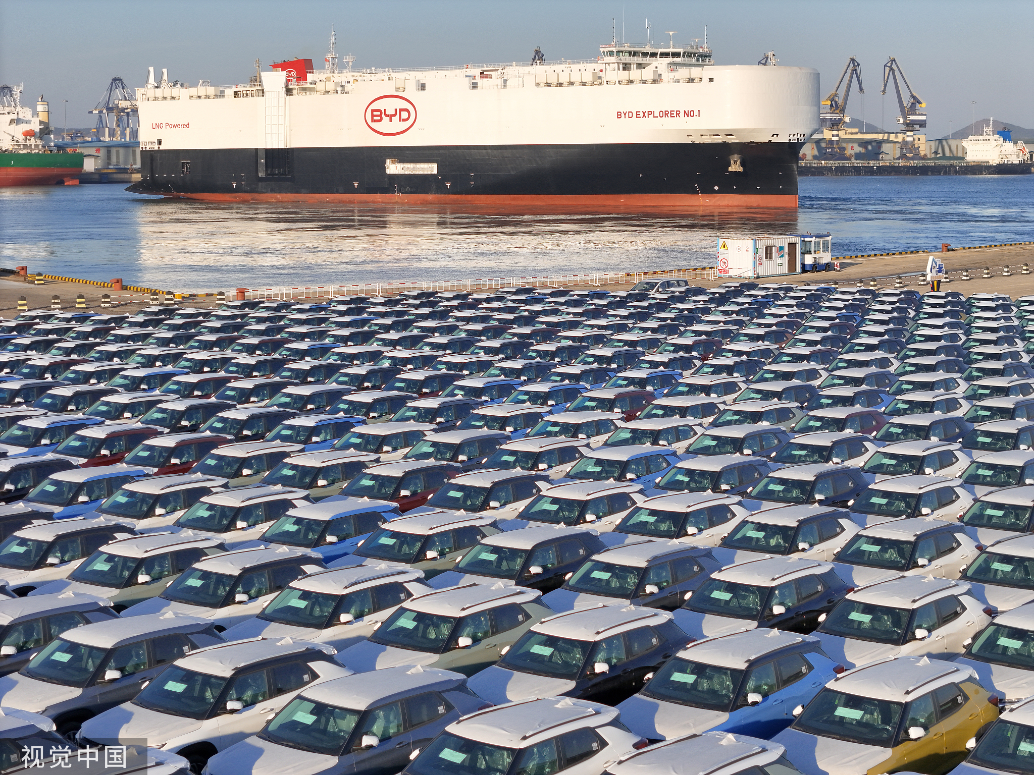 1月10日,裝載着新能源汽車的“比亞迪開拓者1號”從煙台港啓航 圖自視覺中國