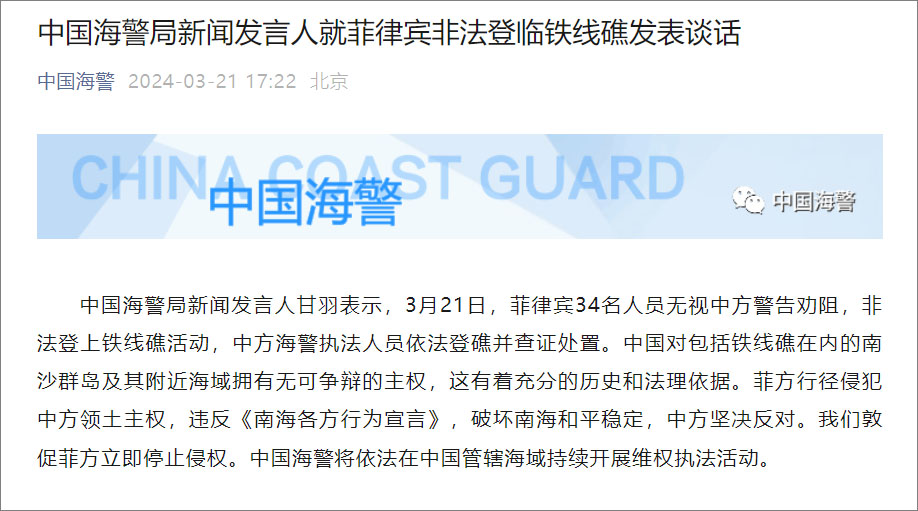 據中國海警微信公眾號消息,中國海警局新聞發言人甘羽表示,3月21日,菲律賓34名人員無視中方警告勸阻,非法登上鐵線礁活動,中方海警執法人員依法登礁並查證處置。