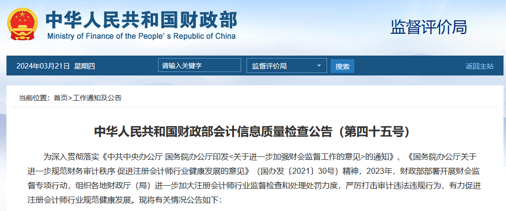 中華人民共和國財政部會計信息質量檢查公告(第四十五號)