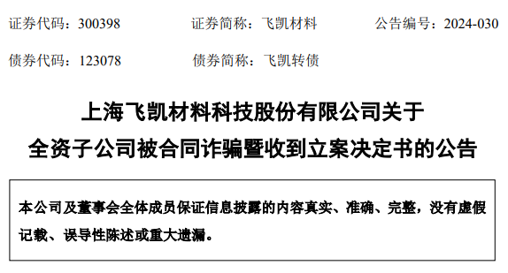 合同詐騙公告摘要,數據來源:飛凱材料公告