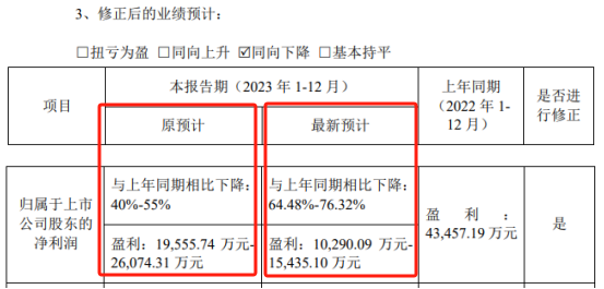 並且3月19日晚間,飛凱材料還將2023年業績預告進行修正。其中修正前,其預計歸母淨利潤為1.96億元至2.61億元,修正後預計歸母淨利潤為1.03億元至1.54億元。對此,飛凱材料表示,根據公安機關截至目前的偵查情況,公司面臨較大的資產減值損失風險,因此對前次發佈的業績預告進行修正。