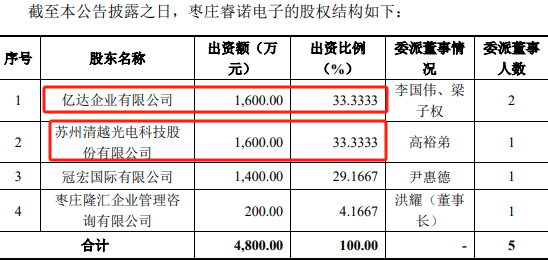 上市公司清越科技目前持有棗莊睿諾電子33.33%股權,與港股上市公司億都實際控制的億達企業有限公司的持股比例相同,均為第一大股東。