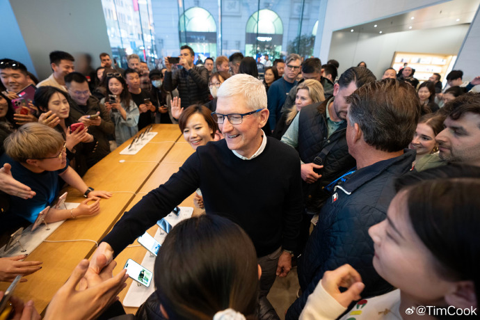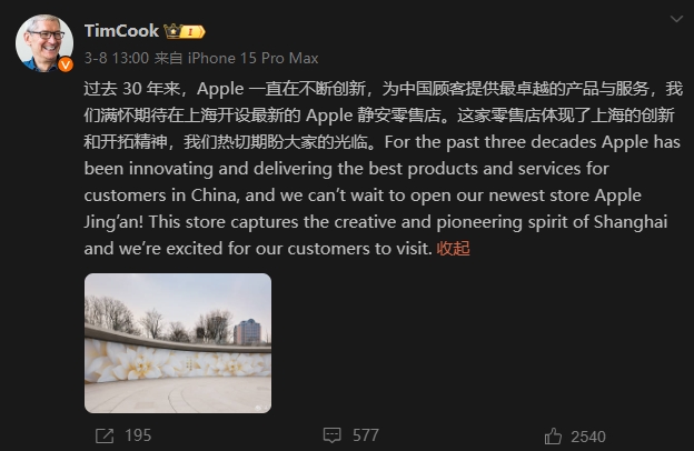 庫克此前在微博發文稱,3月21日,蘋果位於上海靜安的新門店開張,他將出席開店儀式。