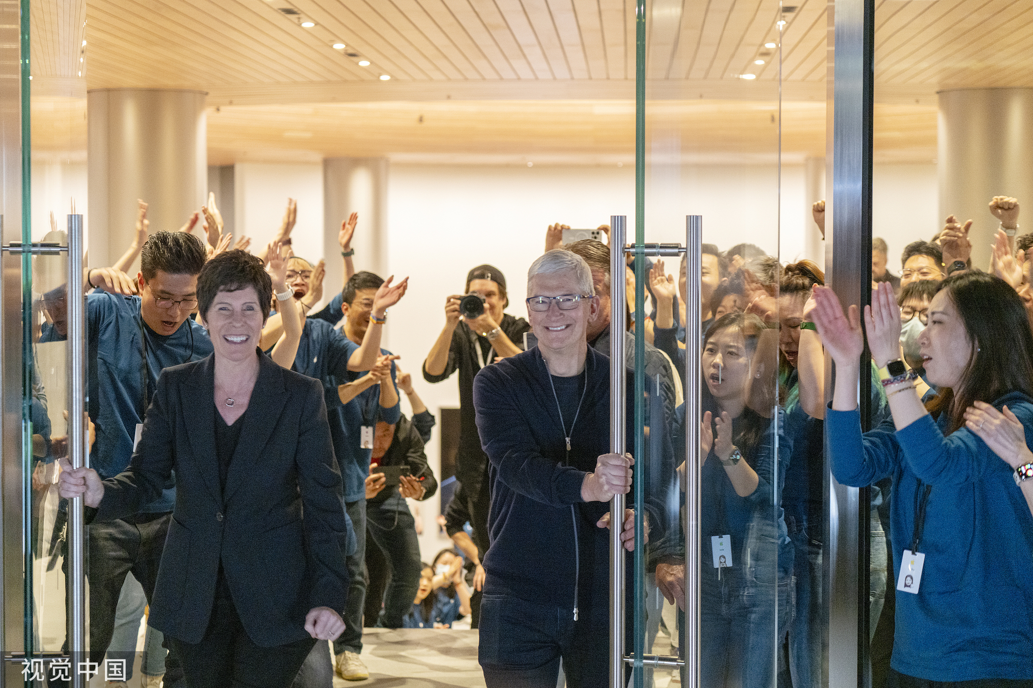 21日晚,庫克現身蘋果上海靜安新店。圖自視覺中國