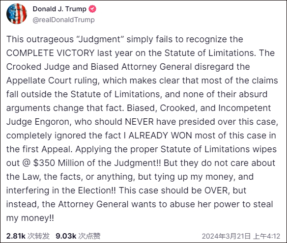 特朗普19日表示,他可能被迫以“賤賣價”抵押或出售部分房地產業務,以支付保證金。20日,他再次控訴紐約州法官“不關心法律,不關心事實,什麼都不關心,只關心我的錢,干涉選舉!!這個案子應該結束了,但是總檢察長卻想濫用她的權力來偷我的錢!!”