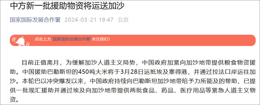 據國家國際發展合作署微信公眾號3月21日消息,目前正值齋月,為緩解加沙人道主義局勢,中國政府加緊向加沙地帶提供糧食物資援助。中國援助巴勒斯坦的450噸大米將於3月28日運抵埃及塞得港,並通過拉法口岸運往加沙。