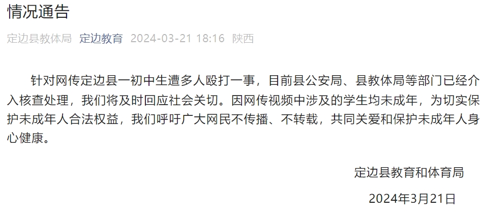 據微信公眾號“定邊教育”消息,定邊縣教體局3月21日發佈情況通報,針對網傳定邊縣一初中生遭多人毆打一事,目前縣公安局、縣教體局等部門已經介入核查處理,我們將及時回應社會關切。因網傳視頻中涉及的學生均未成年,為切實保護未成年人合法權益,我們呼籲廣大網民不傳播、不轉載,共同關愛和保護未成年人身心健康。