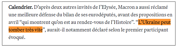 (觀察者網訊)“政客新聞網”歐洲版(politico.eu)3月21日報道,法國總統馬克龍20日在愛麗捨宮會見法國政界人士,討論了即將舉行的歐洲議會選舉等事項。“政客新聞網”援引一名參會者的話稱,期間,馬克龍表示“烏克蘭可能很快就要失敗(L’Ukraine peut tomber très vite)”。