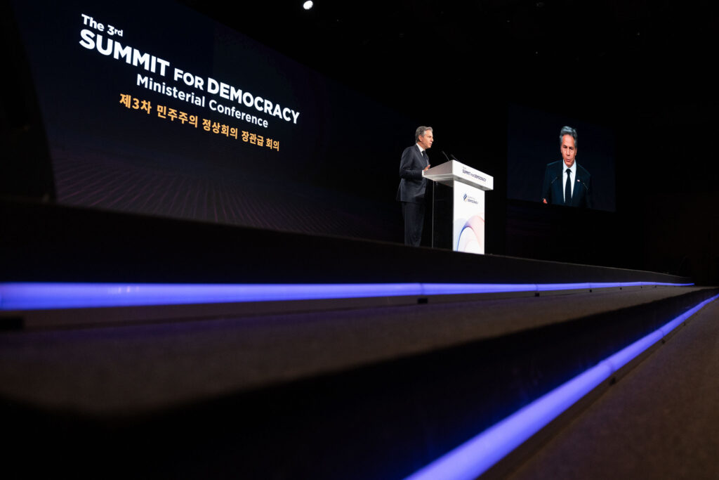 布林肯18日在第三屆民主峯會部長級會議上發言(圖源:美國駐華大使館)