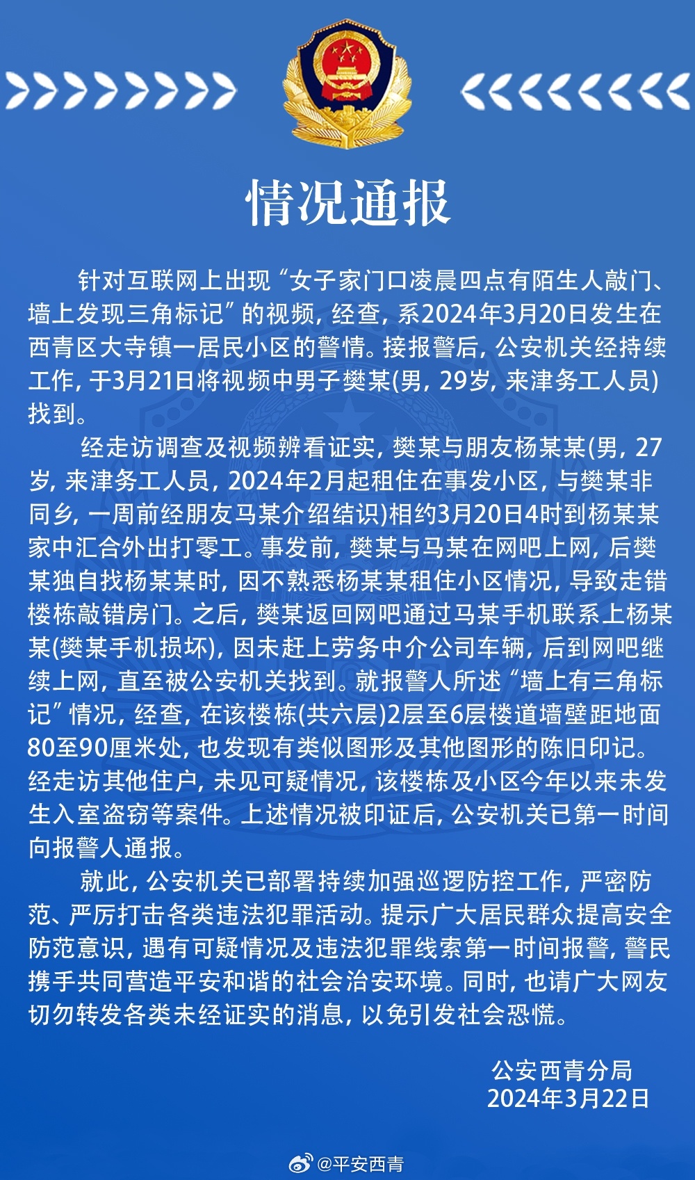 針對互聯網上出現“女子家門口凌晨四點有陌生人敲門、牆上發現三角標記”的視頻,經查,系2024年3月20日發生在西青區大寺鎮一居民小區的警情。接報警後,公安機關經持續工作,於3月21日將視頻中男子樊某(男,29歲,來津務工人員)找到。