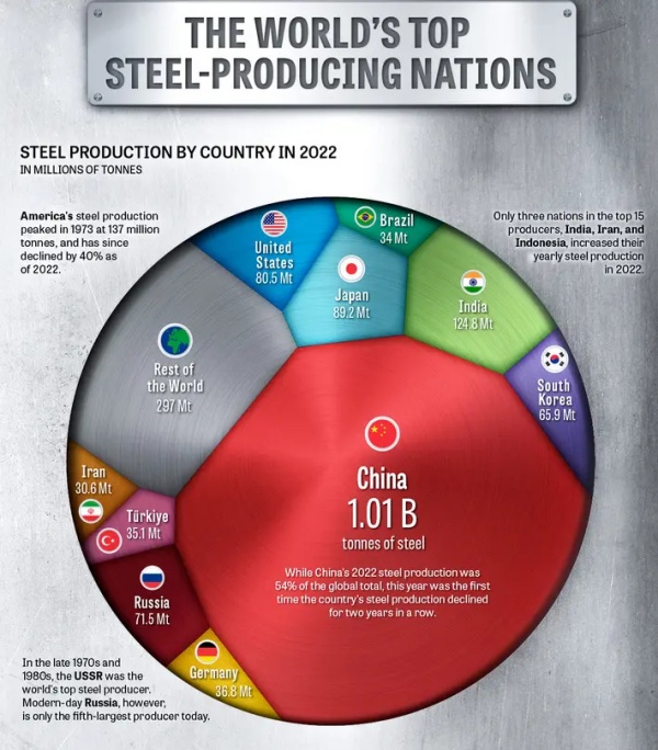 外媒繪製的2022年全球十五大鋼鐵生產國,當年中國鋼產量為10.13億噸。