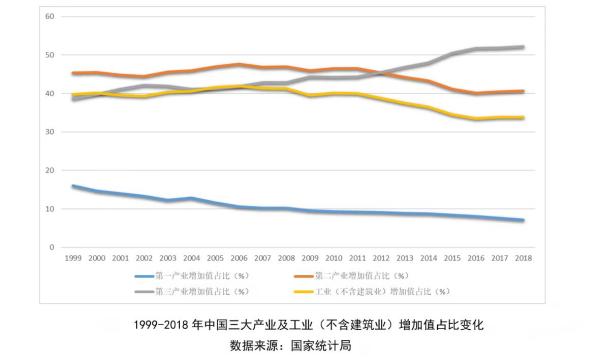 2011年之後,中國第二產業的增加值以及狹義上不含建築業的工業增加值佔GDP比例均出現持續下滑趨勢,截至2018年已經分別較之於2011年下降了5.8和6.1個百分點。圖片由作者提供
