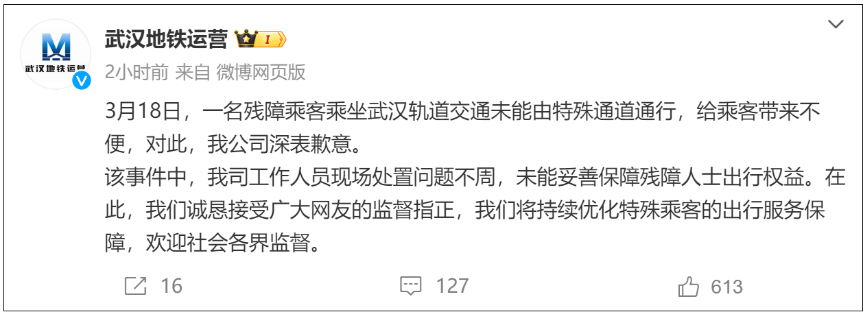 3月18日,一名殘障乘客乘坐武漢軌道交通未能由特殊通道通行,給乘客帶來不便,對此,我公司深表歉意。