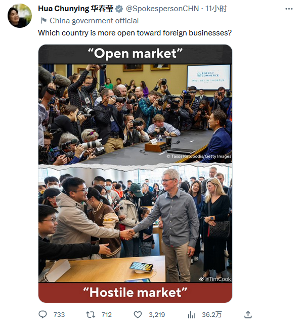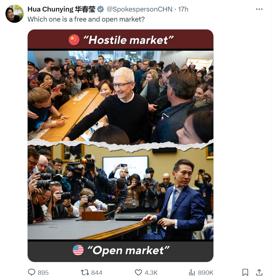 3月21日,中國外交部部長助理、發言人華春瑩在X(原推特)上發佈了一張圖片,對比了蘋果首席執行官庫克訪華盛況與TikTok首席執行官周受資出席美國國會聽證會的不同畫面。