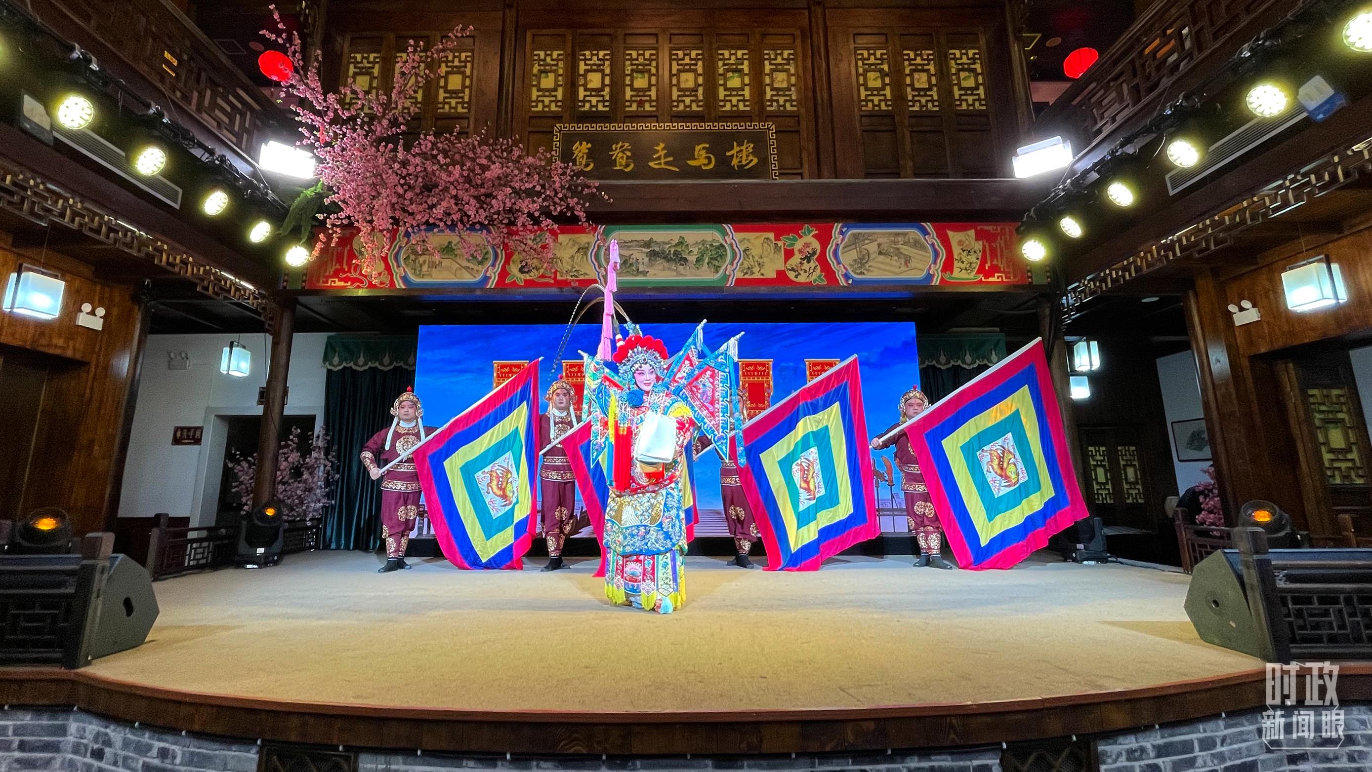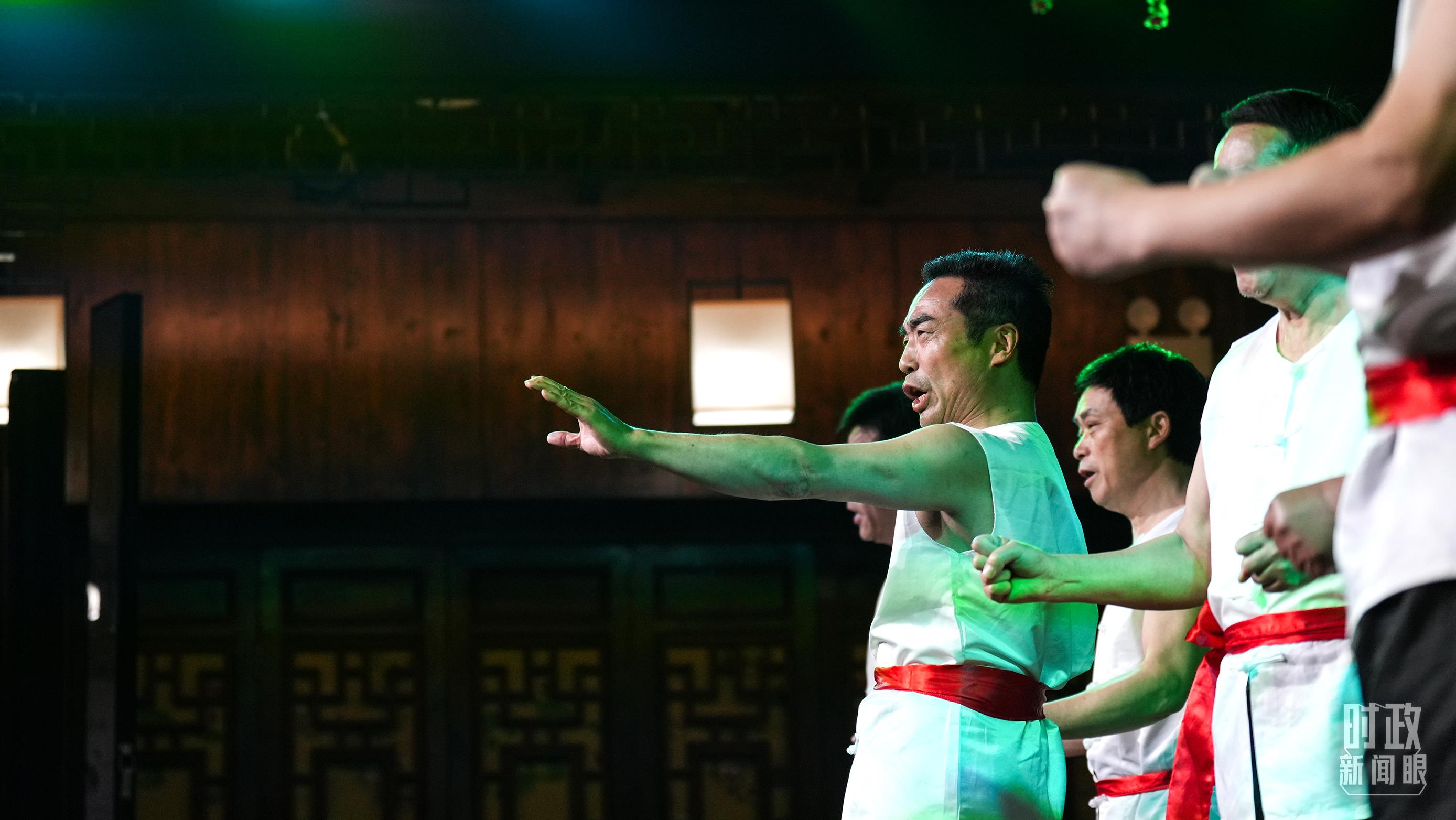 △常德河街,鴛鴦走馬樓上演常德高腔《穆桂英掛帥》和澧水船工號子。(總枱央視記者許永松、國廣記者李晉拍攝)