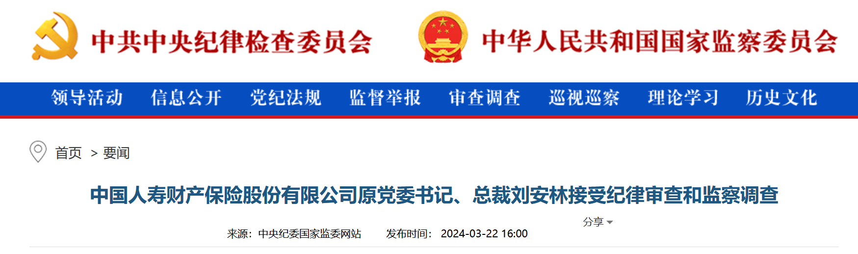 中國人壽財產保險股份有限公司原黨委書記、總裁劉安林接受紀律審查和監察調查