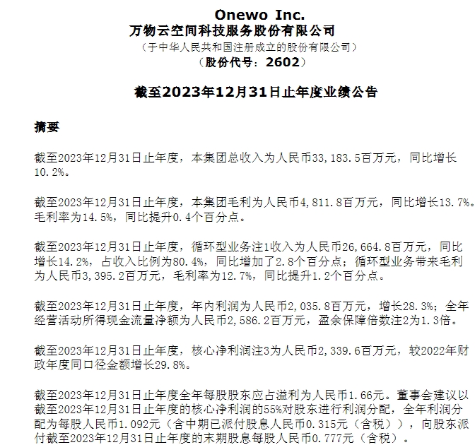與此同時,萬物雲將大手筆分紅。董事會建議以截至2023年12月31日止年度的核心淨利潤的55%對股東進行利潤分配,全年利潤分配為每股1.092元(含中期已派付股息0.315元(含税))。若以3月21日收盤價計算,分紅率約66%,股息率高達6.23%。