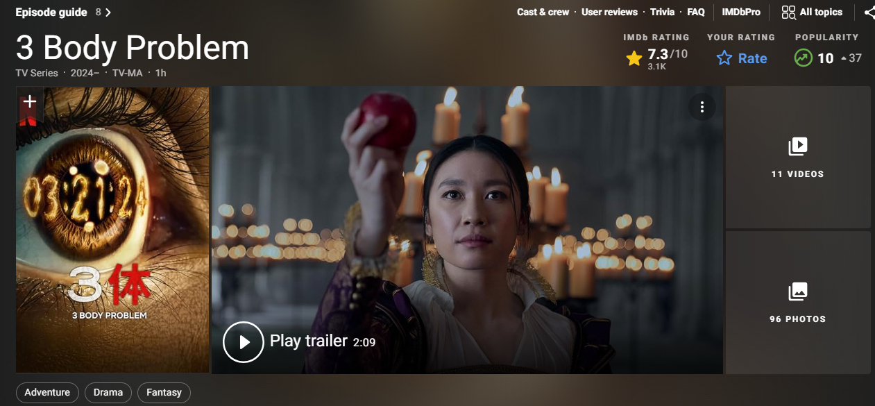 截止流媒體平台上線二十四小時後,網飛版《三體》在海內外得到的評價都很兩極化,只看評分,部分平台給出的答案是質量尚可,但細看評論,就會發現嚴重的兩極化。