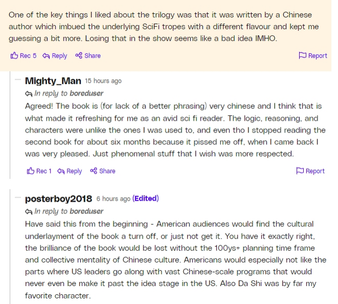 在海外的觀眾中,有不少給予低分的長評都寫過類似的句子:我看過原著,但我不喜歡這個改編,它沒有體現裏面包含的中國特有的思想內涵和人文主義,我想看到有中國特色的影視改編。