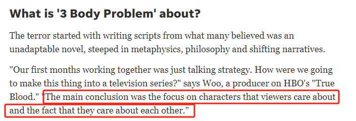 對此,唯一靠譜的解釋可能還是來自之前對網飛《三體》劇組的採訪,製片人説的那個“他們要關注角色之間彼此相互關心的關係”的結論。