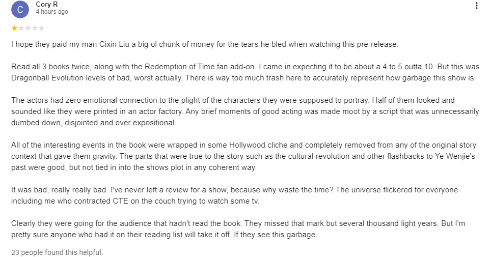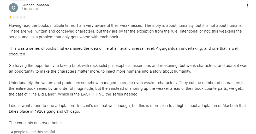 《每日郵報》的編輯則嫌棄劇情在講解世界觀上進展的太慢,更為毒辣地在網飛版《三體》的影評中吐槽;“兩個小時後,我們才開始瞭解這個故事的內容是外星人入侵的威脅。”並話鋒一轉展開對編劇的批評:“在那之前,很多觀眾會放棄,困惑於這些不討喜的角色,陳詞濫調的情節設計。我經常在想這兩個編劇究竟是有遠見的天才,還是隻是兩個碰巧改編了喬治·馬丁的鉅作《性與龍》(這裏指《權力的遊戲》)時走運的蠢貨。”