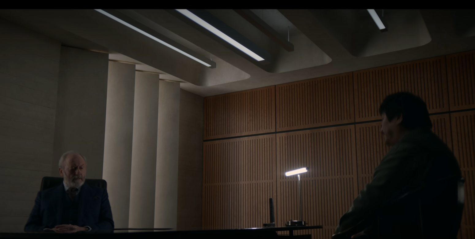 而在情節推動上,更是讓少數幾個存續的角色實現了大包大攬。維德化身全能一把手,事無鉅細,全都親自過問,給大史下指令的是他,招募章北海的是他(沒錯,在這裏章北海蔘加了古箏行動),陪汪淼在指揮室看審判日號被切的是他,帶程心和其他科學家開會的是他,測試躺在病牀上的雲天明的也是他。而除此之外的大多數時間裏,他都穿着一身板正的深色制服,坐在空蕩蕩的只有一張桌子一把枱燈的莊園大房間裏,奮筆疾書地在紙張上寫着什麼。